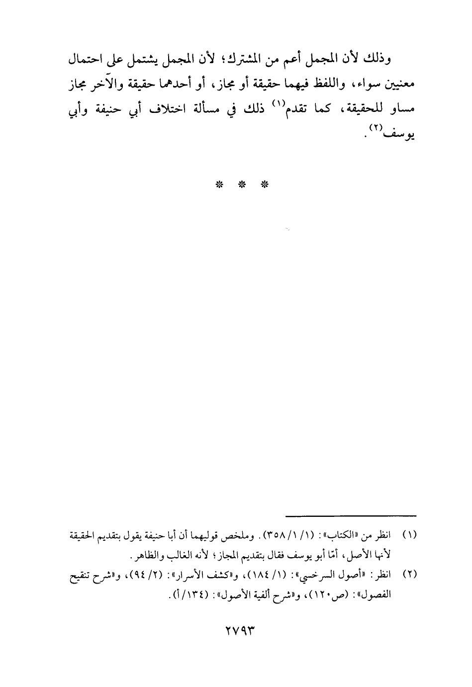 وَذَلِكَ لِأَن الْمُجْمل أَعم من الْمُشْتَرك؛ لِأَن الْمُجْمل يشْتَمل على احْتِمَال مَعْنيين سَوَاء، وَاللَّفْظ فيهمَا حَقِيقَة أَو مجَاز، أَو أَحدهمَا حَقِيقَة وَالْآخر مجَاز مسَاوٍ للْحَقِيقَة، كَمَا تقدم ذَلِك فِي مَسْأَلَة اخْتِلَاف أبي حنيفَة وَأبي يُوسُف.