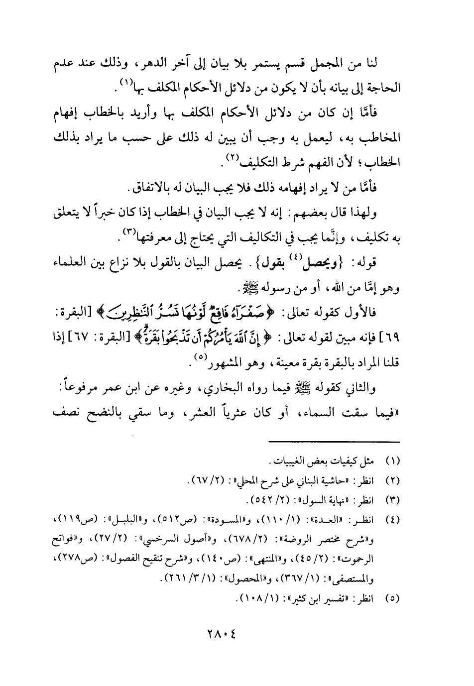 وَلِهَذَا قَالَ بَعضهم: إِنَّه لَا يجب الْبَيَان فِي الْخطاب إِذا كَانَ خَبرا لَا يتَعَلَّق بِهِ تَكْلِيف، وَإِنَّمَا يجب فِي التكاليف الَّتِي يحْتَاج إِلَى مَعْرفَتهَا.