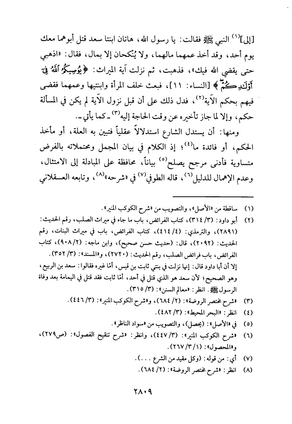 [إِلَى] النَّبِي - صَلَّى اللَّهُ عَلَيْهِ وَسَلَّم َ - فَقَالَت: يَا رَسُول الله، هَاتَانِ ابنتا سعد قتل أَبوهُمَا مَعَك يَوْم أحد، وَقد أَخذ عَمهمَا مَالهمَا، وَلَا ينكحان إِلَّا بِمَال، فَقَالَ: " اذهبي حَتَّى يقْضِي الله فِيك "، فَذَهَبت، ثمَّ نزلت آيَة الْمِيرَاث: {يُوصِيكُم الله فِي أَوْلَادكُم} [النِّسَاء: ١١] ، فَبعث خلف الْمَرْأَة وابنتيها وعمهما فَقضى فيهم بِحكم الْآيَة، فَدلَّ ذَلِك على أَن قبل نزُول الْآيَة لم يكن فِي الْمَسْأَلَة حكم، وَإِلَّا لما جَازَ تَأْخِيره عَن وَقت الْحَاجة إِلَيْهِ - كَمَا يَأْتِي -.