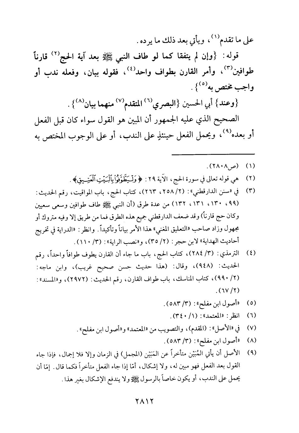 قَوْله: {وَإِن لم يتَّفقَا كَمَا لَو طَاف النَّبِي - صَلَّى اللَّهُ عَلَيْهِ وَسَلَّم َ - بعد آيَة الْحَج قَارنا طوافين، وَأمر الْقَارِن بِطواف وَاحِد، فَقَوله بَيَان، وَفعله ندب أَو وَاجِب مُخْتَصّ بِهِ} .
