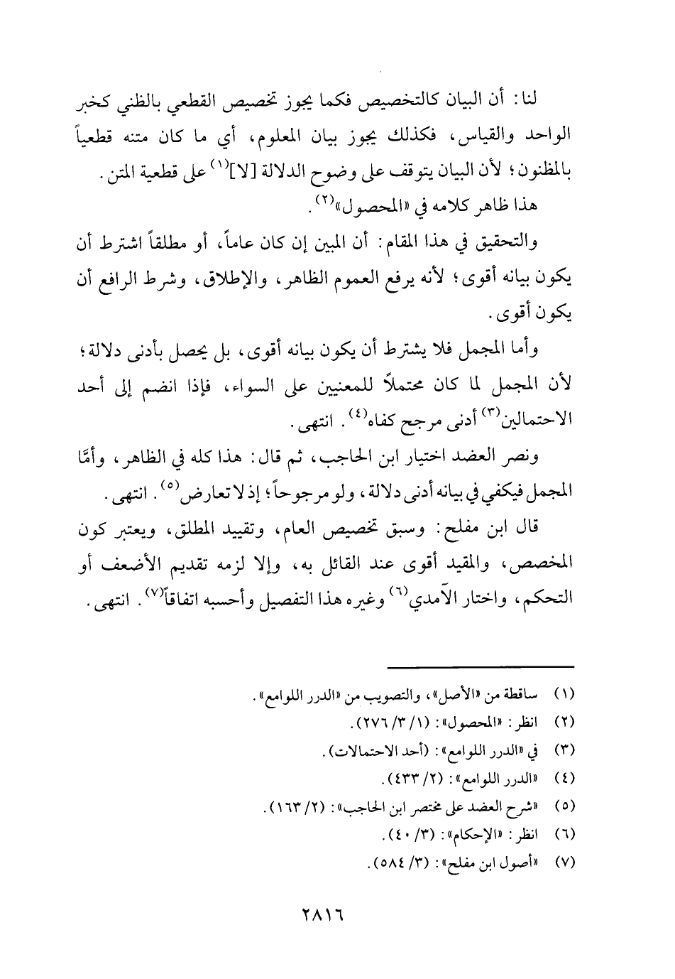 وَالتَّحْقِيق فِي هَذَا الْمقَام: أَن الْمُبين إِن كَانَ عَاما، أَو مُطلقًا اشْترط أَن يكون بَيَانه أقوى؛ لِأَنَّهُ يرفع الْعُمُوم الظَّاهِر، وَالْإِطْلَاق، وَشرط الرافع أَن يكون أقوى.