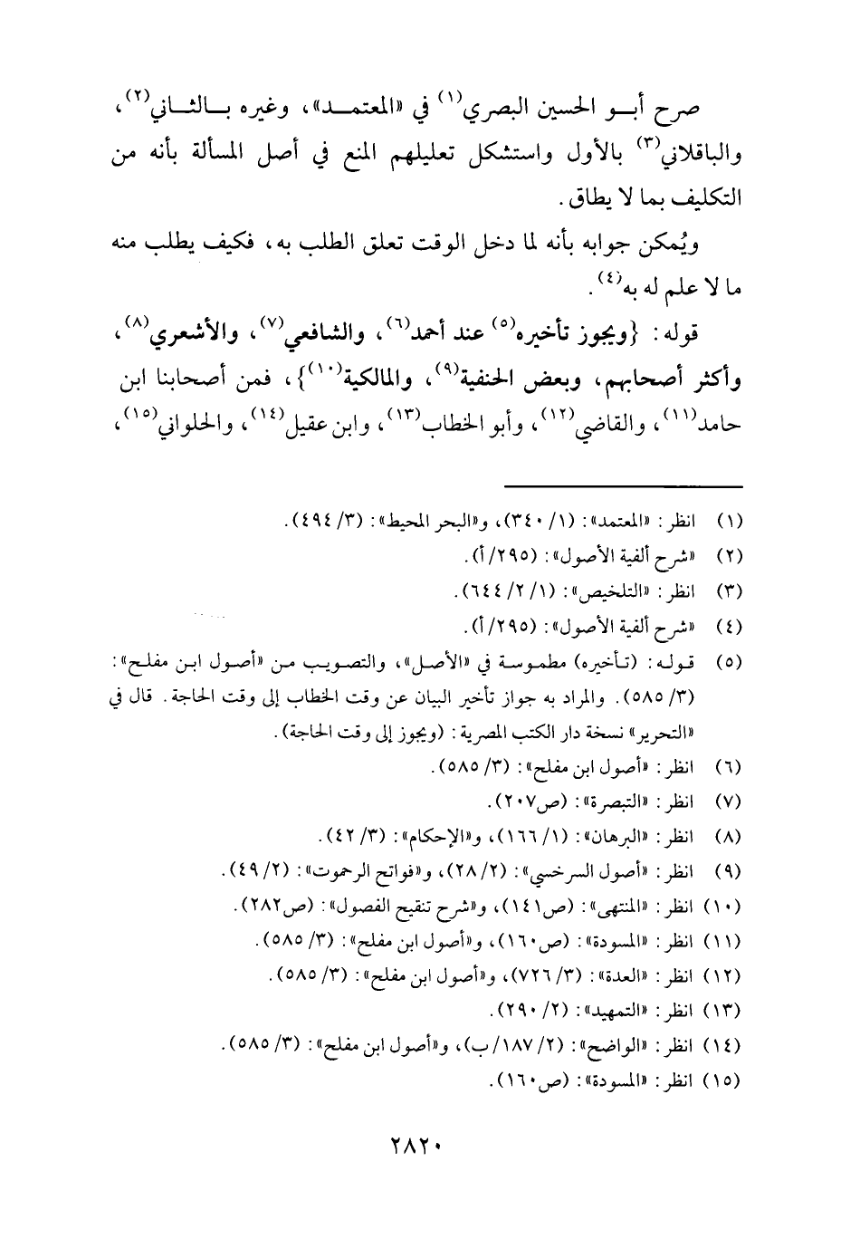 قَوْله: {وَيجوز تَأْخِيره عِنْد أَحْمد، وَالشَّافِعِيّ، والأشعري، وَأكْثر أَصْحَابهم، وَبَعض الْحَنَفِيَّة، والمالكية} ، فَمن أَصْحَابنَا ابْن حَامِد، وَالْقَاضِي، وَأَبُو الْخطاب، وَابْن عقيل، والحلواني، ِ