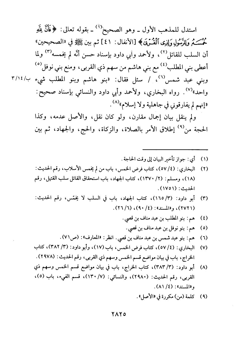 اسْتدلَّ للْمَذْهَب الأول - وَهُوَ الصَّحِيح - بقوله تَعَالَى: {فَأن لله خمسه وَلِلرَّسُولِ وَلِذِي الْقُرْبَى} [الْأَنْفَال: ٤١] ثمَّ بَين - صَلَّى اللَّهُ عَلَيْهِ وَسَلَّم َ - فِي " الصَّحِيحَيْنِ " أَن السَّلب للْقَاتِل، وَلأَحْمَد وَأبي دَاوُد بِإِسْنَاد حسن أَنه لم يخمسه وَلما أعْطى بني الْمطلب مَعَ بني هَاشم من سهم ذِي الْقُرْبَى، وَمنع بني نَوْفَل وَبني عبد شمس، سُئِلَ فَقَالَ: " بَنو هَاشم وَبَنُو الْمطلب شَيْء وَاحِد ". رَوَاهُ البُخَارِيّ، وَلأَحْمَد وَأبي دَاوُد وَالنَّسَائِيّ بِإِسْنَاد صَحِيح: " إِنَّهُم لم يُفَارِقُونِي فِي جَاهِلِيَّة وَلَا إِسْلَام ".