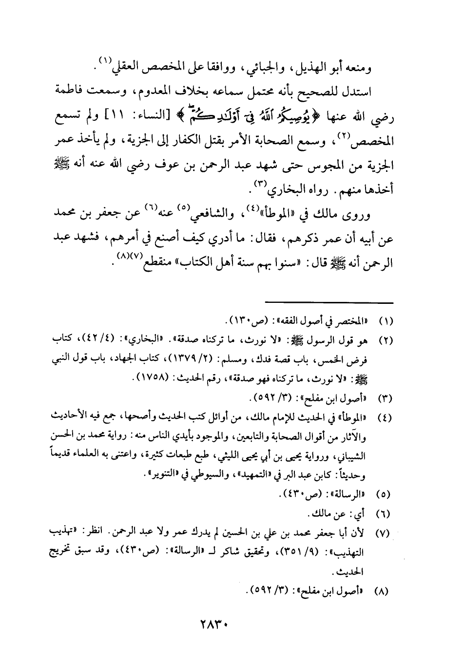 وروى مَالك فِي " الْمُوَطَّأ "، وَالشَّافِعِيّ عَنهُ عَن جَعْفَر بن مُحَمَّد عَن أَبِيه أَن عمر ذكرهم، فَقَالَ: مَا أَدْرِي كَيفَ أصنع فِي أَمرهم، فَشهد عبد الرَّحْمَن أَنه - صَلَّى اللَّهُ عَلَيْهِ وَسَلَّم َ - قَالَ: " سنوا بهم سنة أهل الْكتاب " مُنْقَطع.