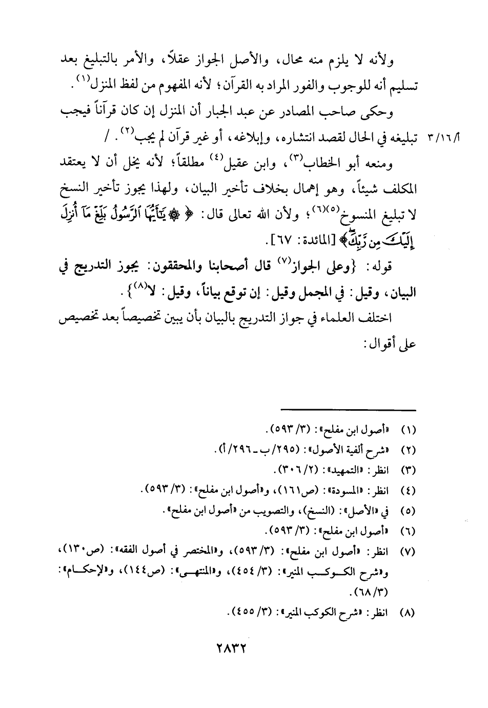 وَحكى صَاحب المصادر عَن عبد الْجَبَّار أَن الْمنزل إِن كَانَ قُرْآنًا فَيجب تبليغه فِي الْحَال لقصد انتشاره، وإبلاغه، أَو غير قُرْآن لم يجب.