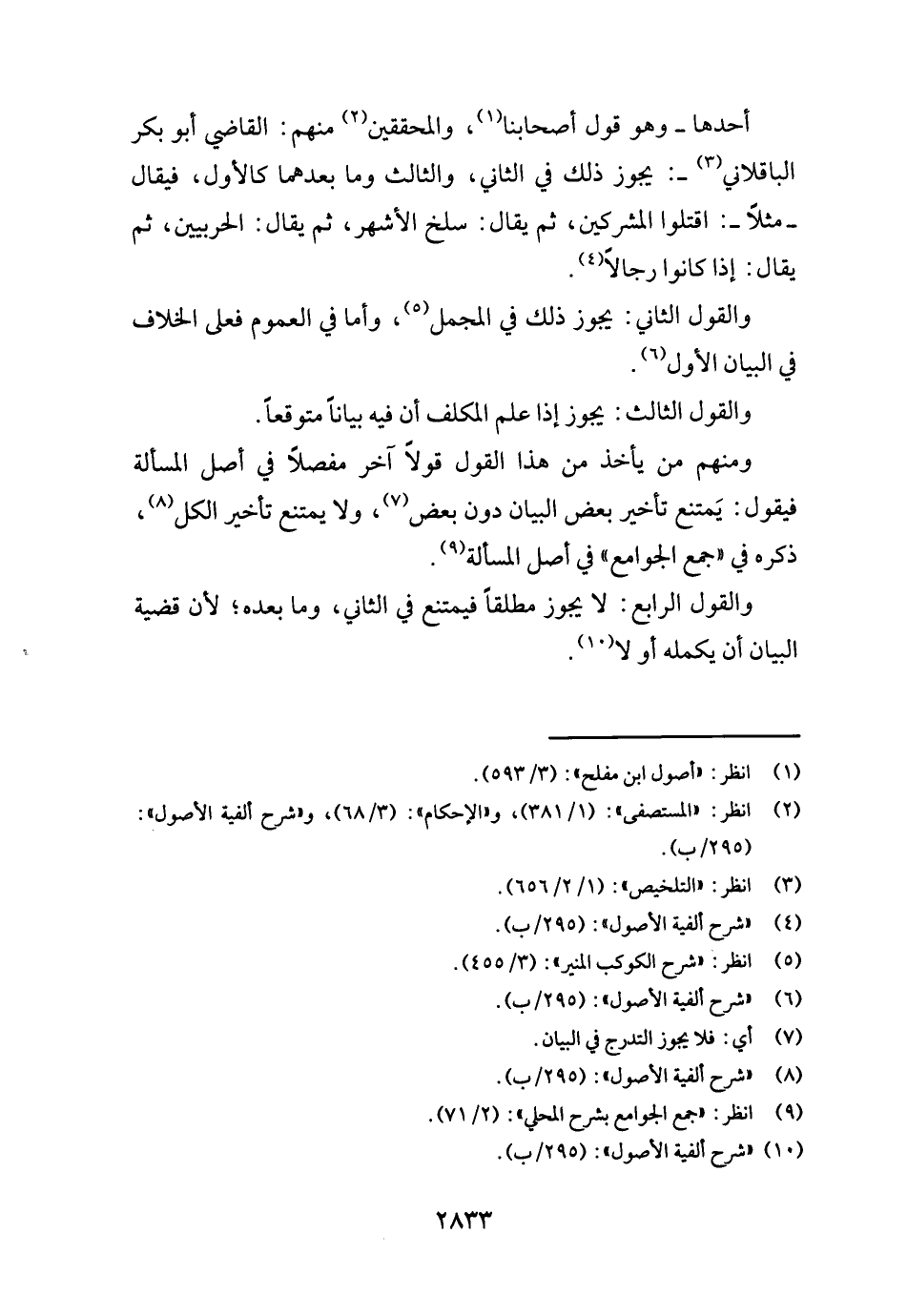 وَمِنْهُم من يَأْخُذ من هَذَا القَوْل قولا آخر مفصلا فِي أصل الْمَسْأَلَة فَيَقُول: يمْتَنع تَأْخِير بعض الْبَيَان دون بعض، وَلَا يمْتَنع تَأْخِير الْكل، ذكره فِي " جمع الْجَوَامِع " فِي أصل الْمَسْأَلَة.