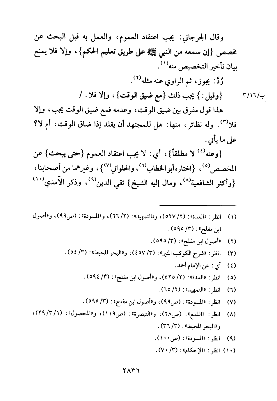 وَقَالَ الْجِرْجَانِيّ: يجب اعْتِقَاد الْعُمُوم، وَالْعَمَل بِهِ قبل الْبَحْث عَن مُخَصص {إِن سَمعه من النَّبِي - صَلَّى اللَّهُ عَلَيْهِ وَسَلَّم َ - على طَرِيق تَعْلِيم الحكم} ، وَإِلَّا فَلَا يمْنَع بَيَان تَأْخِير التَّخْصِيص مِنْهُ.