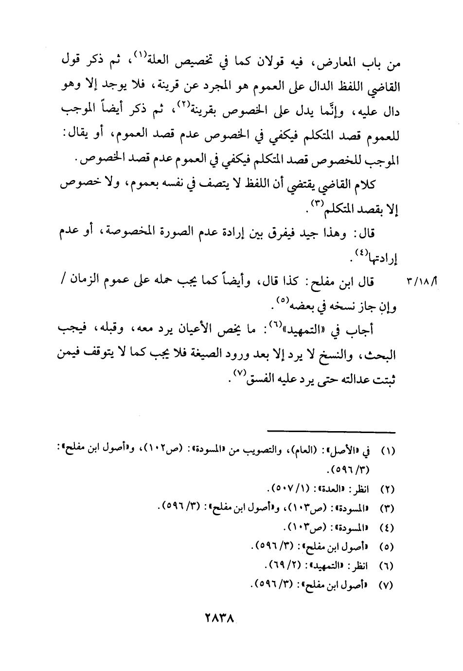 من بَاب الْمعَارض، فِيهِ قَولَانِ كَمَا فِي تَخْصِيص الْعلَّة، ثمَّ ذكر قَول القَاضِي اللَّفْظ الدَّال على الْعُمُوم هُوَ الْمُجَرّد عَن قرينَة، فَلَا يُوجد إِلَّا وَهُوَ دَال عَلَيْهِ، وَإِنَّمَا يدل على الْخُصُوص بِقَرِينَة، ثمَّ ذكر أَيْضا الْمُوجب للْعُمُوم قصد الْمُتَكَلّم فَيَكْفِي فِي الْخُصُوص عدم قصد الْعُمُوم، أَو يُقَال: الْمُوجب للخصوص قصد الْمُتَكَلّم فَيَكْفِي فِي الْعُمُوم عدم قصد الْخُصُوص.