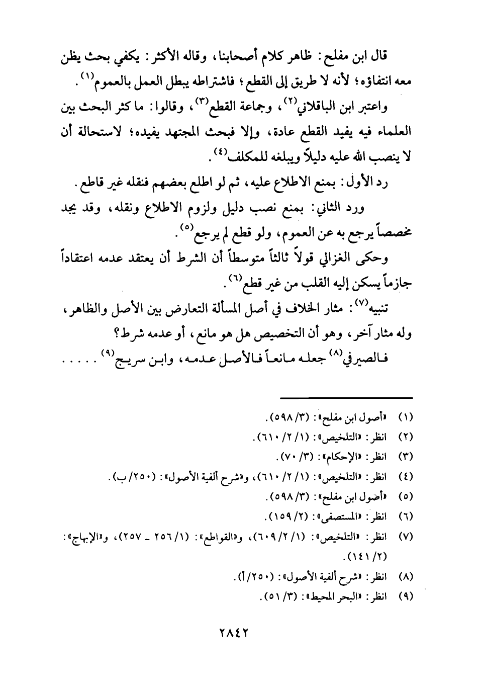 وَاعْتبر ابْن الباقلاني، وَجَمَاعَة الْقطع، وَقَالُوا: مَا كثر الْبَحْث بَين الْعلمَاء فِيهِ يُفِيد الْقطع عَادَة، وَإِلَّا فبحث الْمُجْتَهد يفِيدهُ؛ لِاسْتِحَالَة أَن لَا ينصب الله عَلَيْهِ دَلِيلا ويبلغه للمكلف.