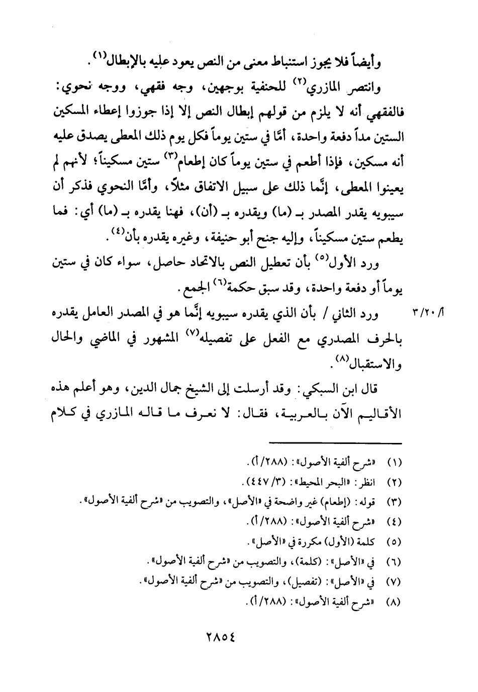 وانتصر الْمَازرِيّ للحنفية بِوَجْهَيْنِ، وَجه فقهي، وَوجه نحوي: فالفقهي أَنه لَا يلْزم من قَوْلهم إبِْطَال النَّص إِلَّا إِذا جوزوا إِعْطَاء الْمِسْكِين السِّتين مدا دفْعَة وَاحِدَة، أما فِي سِتِّينَ يَوْمًا فَكل يَوْم ذَلِك الْمُعْطى يصدق عَلَيْهِ أَنه مِسْكين، فَإِذا أطْعم فِي سِتِّينَ يَوْمًا كَانَ إطْعَام سِتِّينَ مِسْكينا؛ لأَنهم لم يعينوا الْمُعْطى، إِنَّمَا ذَلِك على سَبِيل الِاتِّفَاق مثلا، وَأما النَّحْوِيّ فَذكر أَن سِيبَوَيْهٍ يقدر الْمصدر ب (مَا) ويقدره ب (أَن) فَهُنَا يقدره ب (مَا) أَي: فَمَا يطعم سِتِّينَ مِسْكينا، وَإِلَيْهِ جنح أَبُو حنيفَة، وَغَيره يقدره بِأَن.