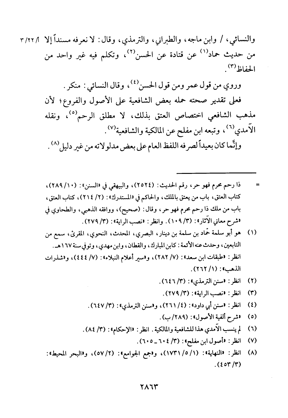 فعلى تَقْدِير صِحَّته حمله بعض الشَّافِعِيَّة على الْأُصُول وَالْفُرُوع؛ لِأَن مَذْهَب الشَّافِعِي اخْتِصَاص الْعتْق بذلك، لَا مُطلق الرَّحِم، وَنَقله الْآمِدِيّ، وَتَبعهُ ابْن مُفْلِح عَن الْمَالِكِيَّة وَالشَّافِعِيَّة.