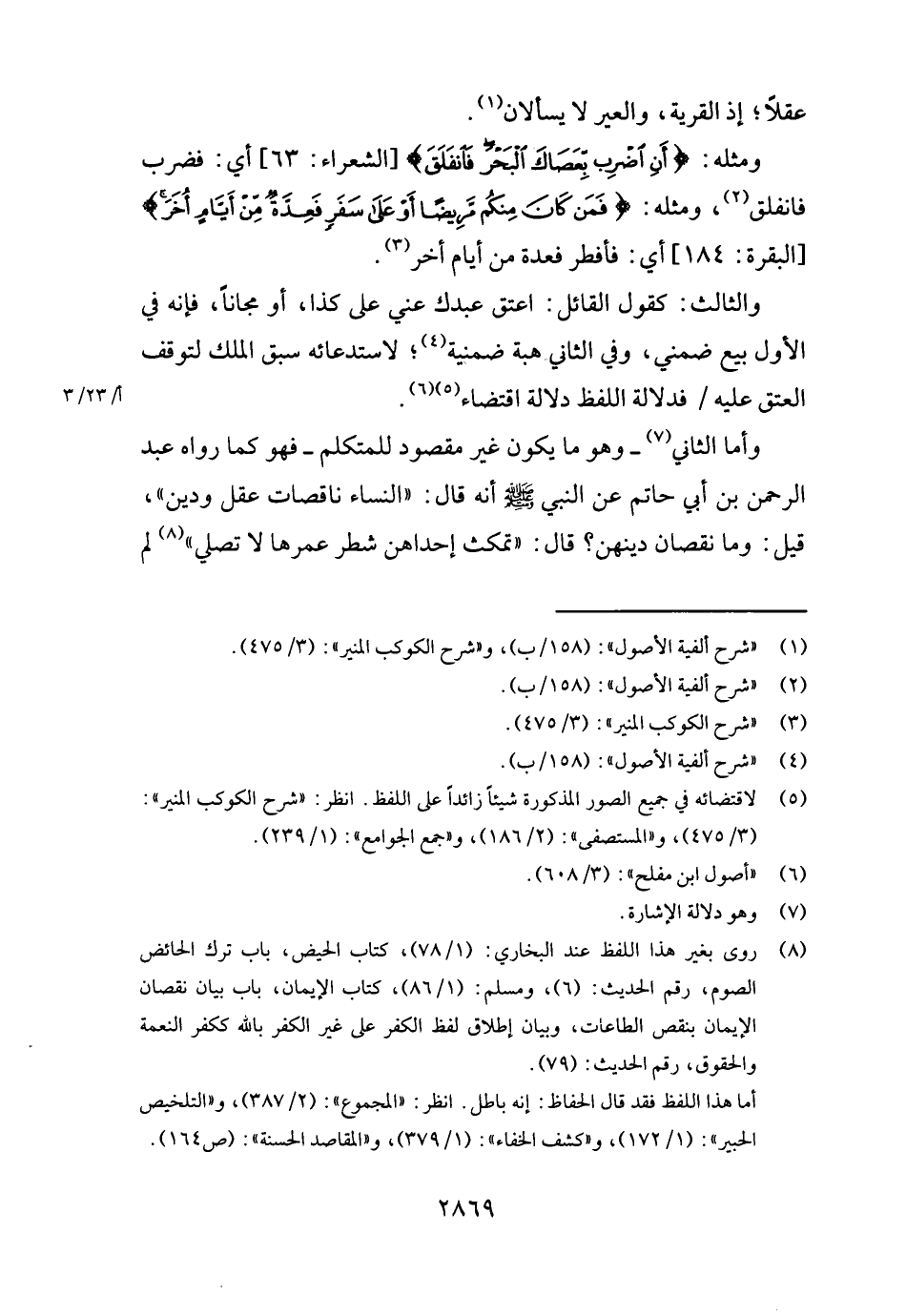 وَأما الثَّانِي - وَهُوَ مَا يكون غير مَقْصُود للمتكلم - فَهُوَ كَمَا رَوَاهُ عبد الرَّحْمَن بن أبي حَاتِم عَن النَّبِي - صَلَّى اللَّهُ عَلَيْهِ وَسَلَّم َ - أَنه قَالَ: " النِّسَاء ناقصات عقل وَدين "، قيل: وَمَا نُقْصَان دينهن؟ قَالَ: " تمكث إِحْدَاهُنَّ شطر عمرها لَا تصلي " لم