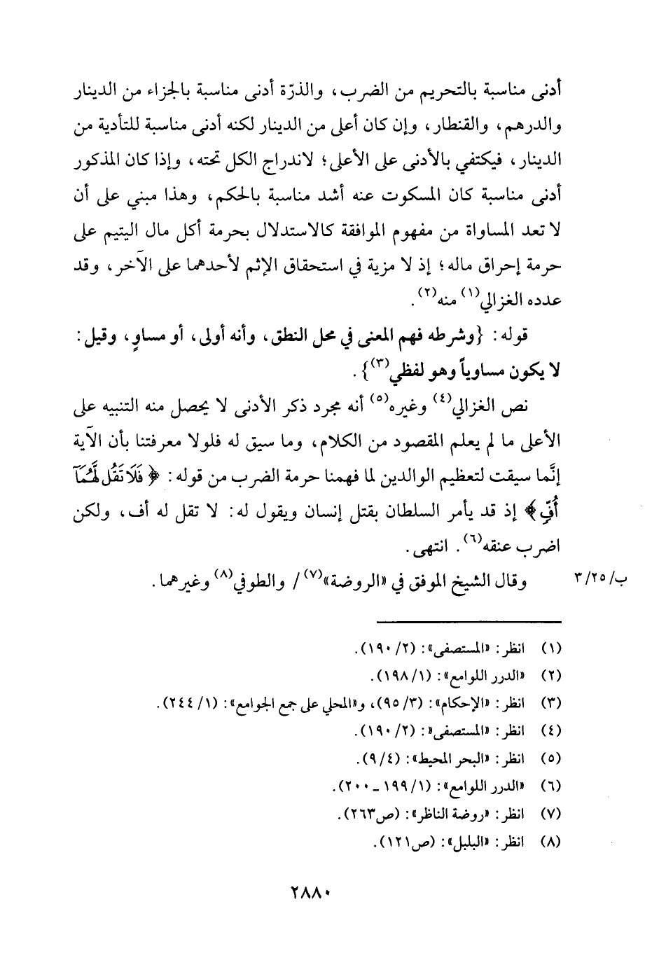 أدنى مُنَاسبَة بِالتَّحْرِيمِ من الضَّرْب، والذرة أدنى مُنَاسبَة بالجزاء من الدِّينَار وَالدِّرْهَم، وَالْقِنْطَار، وَإِن كَانَ أَعلَى من الدِّينَار لكنه أدنى مُنَاسبَة للتأدية من الدِّينَار، فيكتفي بالأدنى على الْأَعْلَى؛ لاندراج الْكل تَحْتَهُ، وَإِذا كَانَ الْمَذْكُور أدنى مُنَاسبَة كَانَ الْمَسْكُوت عَنهُ أَشد مُنَاسبَة بالحكم، وَهَذَا مَبْنِيّ على أَن لَا تعد الْمُسَاوَاة من مَفْهُوم الْمُوَافقَة كالاستدلال بِحرْمَة أكل مَال الْيَتِيم على حُرْمَة إحراق مَاله؛ إِذْ لَا مزية فِي اسْتِحْقَاق الْإِثْم لأَحَدهمَا على الآخر، وَقد عدده الْغَزالِيّ مِنْهُ.