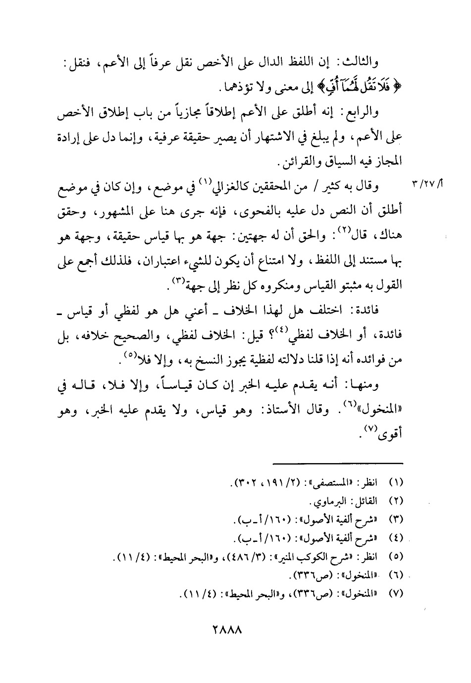وَقَالَ بِهِ كثير من الْمُحَقِّقين كالغزالي فِي مَوضِع، وَإِن كَانَ فِي مَوضِع أطلق أَن النَّص دلّ عَلَيْهِ بالفحوى، فَإِنَّهُ جرى هُنَا على الْمَشْهُور، وحقق هُنَاكَ، قَالَ: وَالْحق أَن لَهُ جِهَتَيْنِ: جِهَة هُوَ بهَا قِيَاس حَقِيقَة، وجهة هُوَ بهَا مُسْتَند إِلَى اللَّفْظ، وَلَا امْتنَاع أَن يكون للشَّيْء اعتباران، فَلذَلِك أجمع على القَوْل بِهِ مثبتو الْقيَاس ومنكروه كل نظر إِلَى جِهَة.