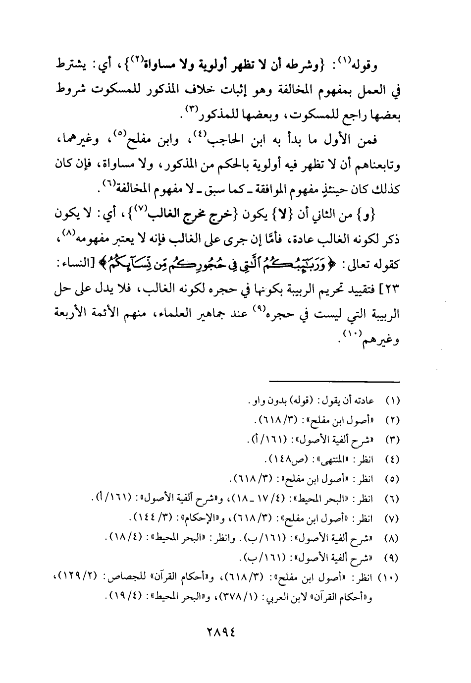 {و} من الثَّانِي أَن {لَا} يكون {خرج مخرج الْغَالِب} ، أَي: لَا يكون ذكر لكَونه الْغَالِب عَادَة، فَأَما إِن جرى على الْغَالِب فَإِنَّهُ لَا يعْتَبر مَفْهُومه، كَقَوْلِه تَعَالَى: {وربائبكم اللَّاتِي فِي حجوركم من نِسَائِكُم} [النِّسَاء: ٢٣] فتقييد تَحْرِيم الربيبة بِكَوْنِهَا فِي حجره لكَونه الْغَالِب، فَلَا يدل على حل الربيبة الَّتِي لَيست فِي حجره عِنْد جَمَاهِير الْعلمَاء، مِنْهُم الْأَئِمَّة الْأَرْبَعَة وَغَيرهم.