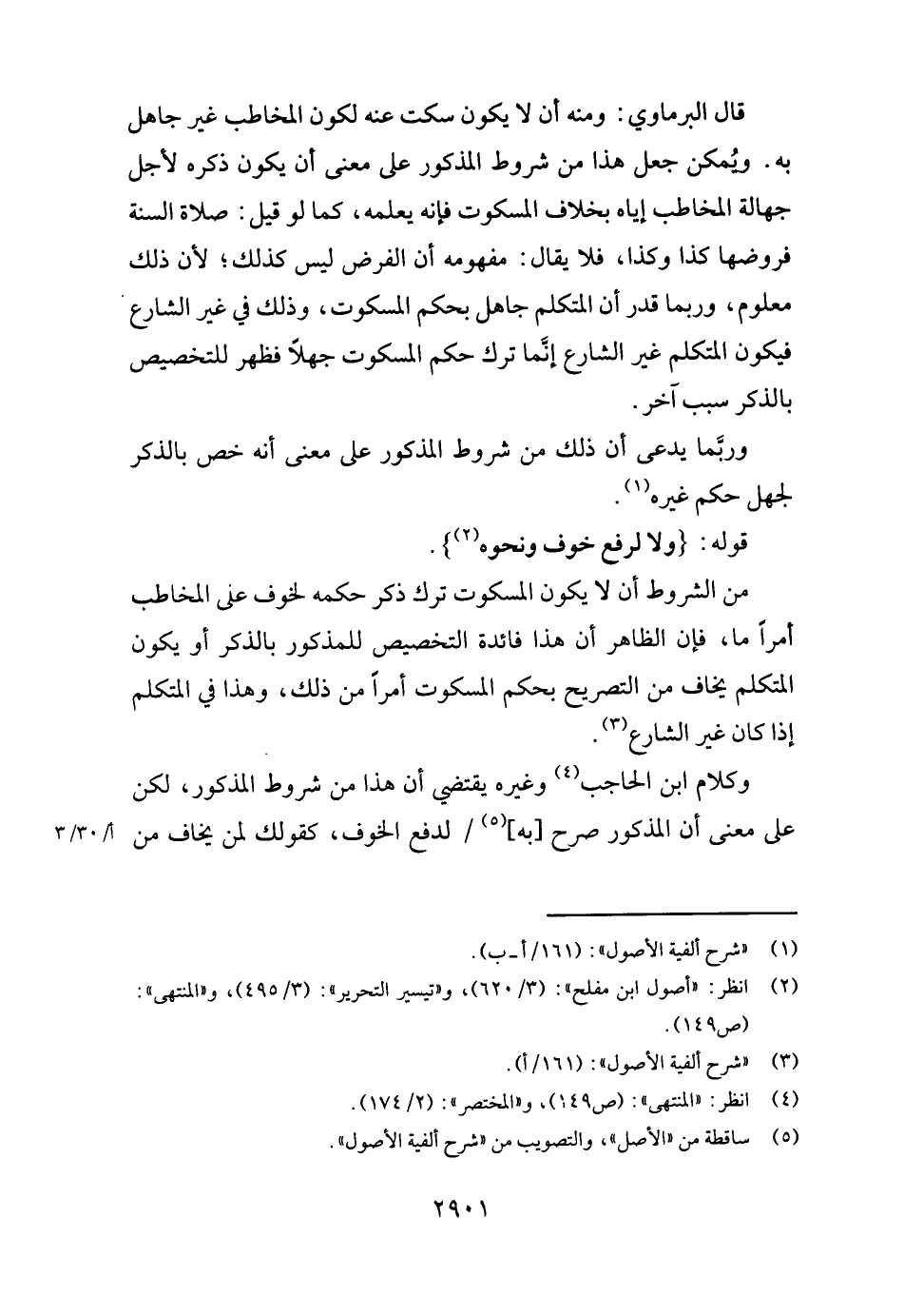 وَكَلَام ابْن الْحَاجِب وَغَيره يَقْتَضِي أَن هَذَا من شُرُوط الْمَذْكُور، لَكِن على معنى أَن الْمَذْكُور صرح [بِهِ] لدفع الْخَوْف، كَقَوْلِك لمن يخَاف من