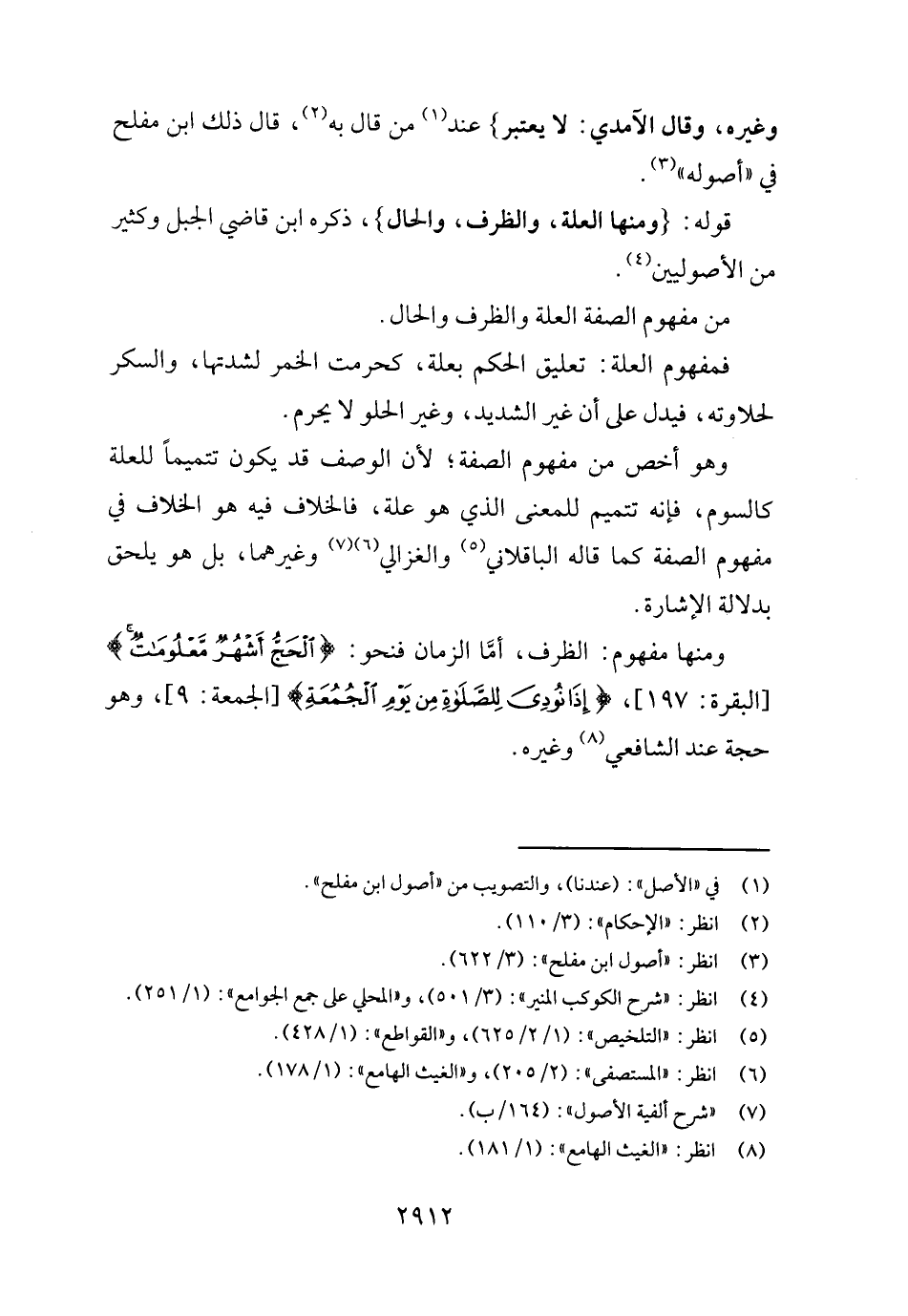 وَمِنْهَا مَفْهُوم: الظّرْف، أما الزَّمَان فنحو: {الْحَج أشهر مَعْلُومَات} [الْبَقَرَة: ١٩٧] ، {إِذا نُودي للصَّلَاة من يَوْم الْجُمُعَة} [الْجُمُعَة: ٩] ، وَهُوَ حجَّة عِنْد الشَّافِعِي وَغَيره.