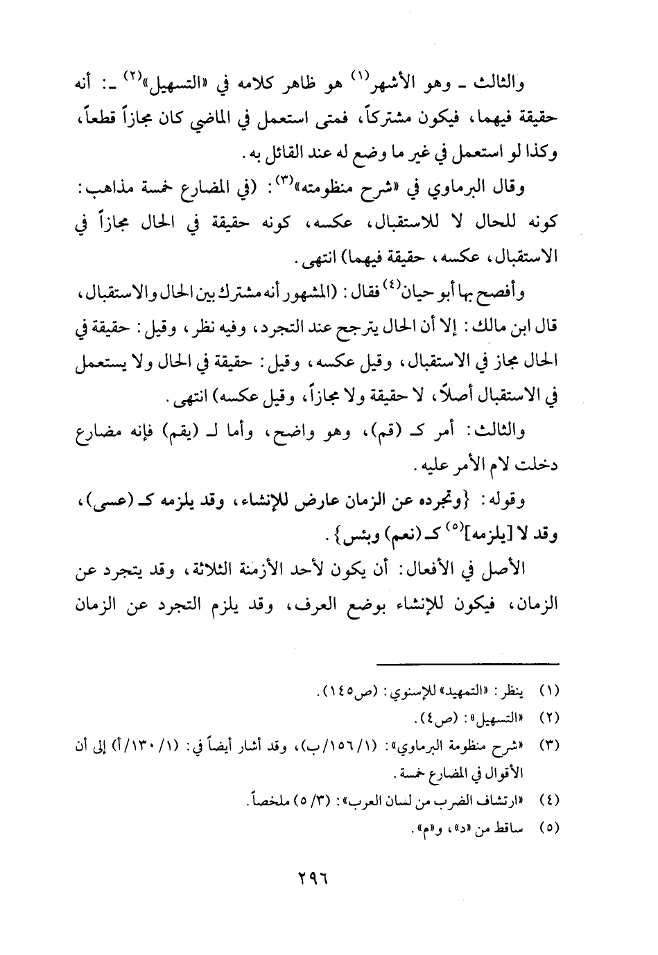وَقَالَ الْبرمَاوِيّ فِي " شرح منظومته ": (فِي الْمُضَارع خَمْسَة مَذَاهِب: كَونه للْحَال لَا للاستقبال، عَكسه، كَونه حَقِيقَة فِي الْحَال مجَازًا فِي الِاسْتِقْبَال، عَكسه، حَقِيقَة فيهمَا) انْتهى.