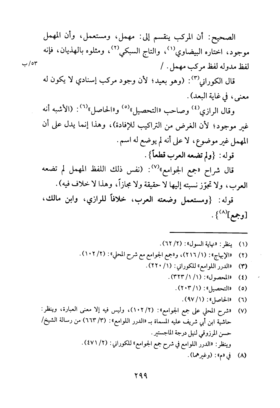 وَقَالَ الرَّازِيّ وَصَاحب " التَّحْصِيل " و " الْحَاصِل ": (الْأَشْبَه أَنه غير مَوْجُود؛ لِأَن الْغَرَض من التراكيب للإفادة) ، وَهَذَا إِنَّمَا يدل على أَن المهمل غير مَوْضُوع، لَا على أَنه لم يوضع لَهُ اسْم.