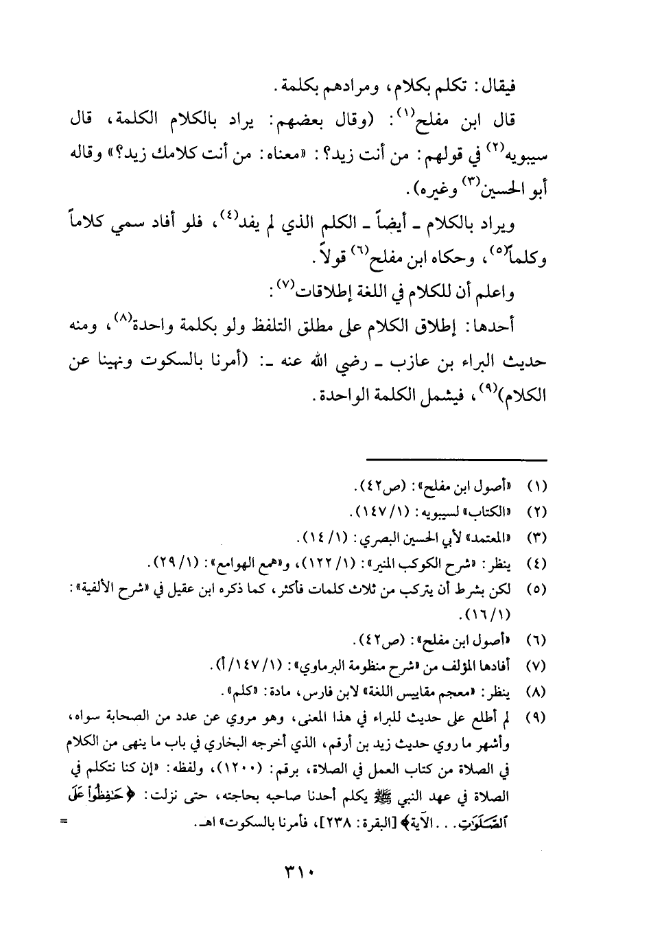 أَحدهَا: إِطْلَاق الْكَلَام على مُطلق التَّلَفُّظ وَلَو بِكَلِمَة وَاحِدَة، وَمِنْه حَدِيث الْبَراء بن عَازِب - رَضِي الله عَنهُ -: (أمرنَا بِالسُّكُوتِ ونهينا عَن الْكَلَام) ، فَيشْمَل الْكَلِمَة الْوَاحِدَة.