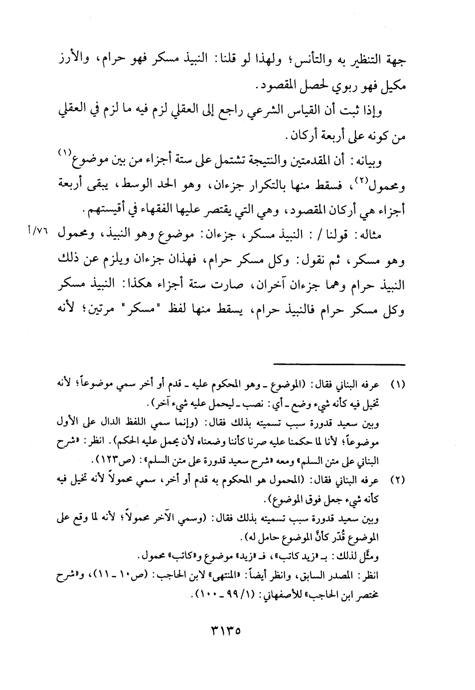 وَبَيَانه: أَن المقدمتين والنتيجة تشْتَمل على سِتَّة أَجزَاء من بَين مَوْضُوع ومحمول، فَسقط مِنْهَا بالتكرار جزءان، وَهُوَ الْحَد الْوسط، يبْقى أَرْبَعَة أَجزَاء هِيَ أَرْكَان الْمَقْصُود، وَهِي الَّتِي يقْتَصر عَلَيْهَا الْفُقَهَاء فِي أقيستهم.
