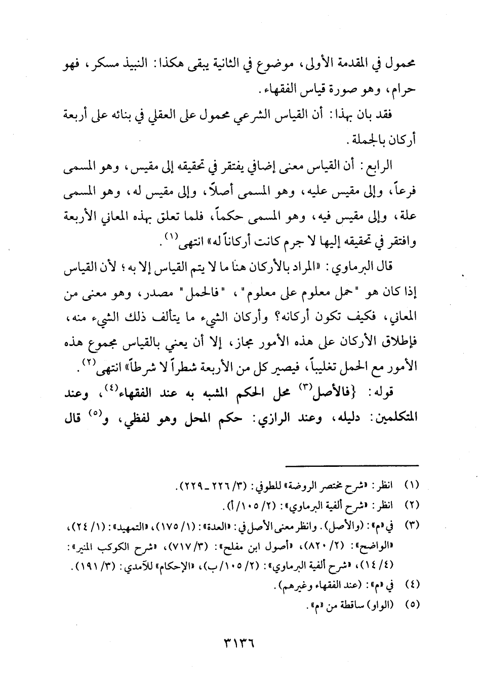 قَالَ الْبرمَاوِيّ: " المُرَاد بالأركان هُنَا مَا لَا يتم الْقيَاس إِلَّا بِهِ، لِأَن الْقيَاس إِذا كَانَ هُوَ " حمل مَعْلُوم على مَعْلُوم "، " فالحمل " مصدر، وَهُوَ معنى من الْمعَانِي، فَكيف تكون أَرْكَانه؟ وأركان الشَّيْء مَا يتألف ذَلِك الشَّيْء مِنْهُ، فإطلاق الْأَركان على هَذِه الْأُمُور مجَاز، إِلَّا أَن يَعْنِي بِالْقِيَاسِ مَجْمُوع هَذِه الْأُمُور مَعَ الْحمل تَغْلِيبًا، فَيصير كل من الْأَرْبَعَة شطراً لَا شرطا " انْتهى.