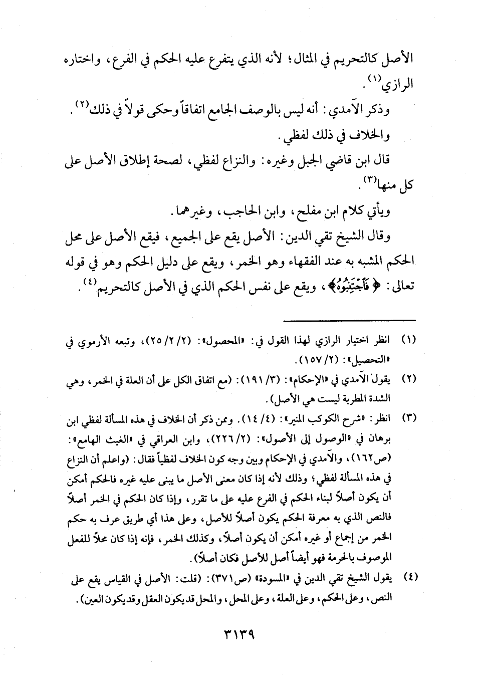 وَقَالَ الشَّيْخ تَقِيّ الدّين: الأَصْل يَقع على الْجَمِيع، فَيَقَع الأَصْل على مَحل الحكم الْمُشبه بِهِ عِنْد الْفُقَهَاء وَهُوَ الْخمر، وَيَقَع على دَلِيل الحكم وَهُوَ فِي قَوْله تَعَالَى: {فَاجْتَنبُوهُ} ، وَيَقَع على نفس الحكم الَّذِي فِي الأَصْل كالتحريم.