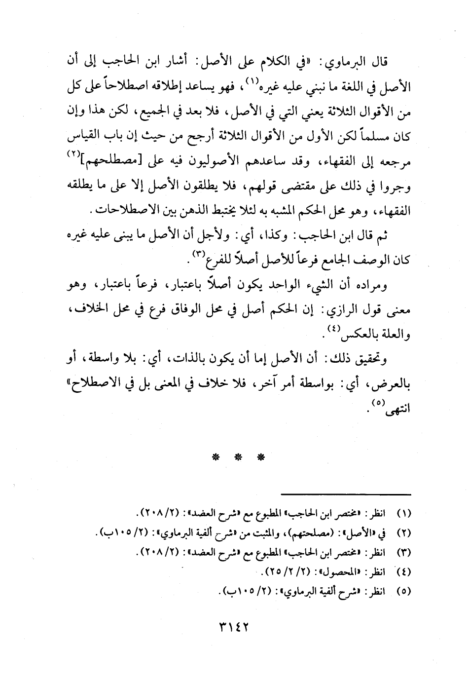 قَالَ الْبرمَاوِيّ: " فِي الْكَلَام على الأَصْل: أَشَارَ ابْن الْحَاجِب إِلَى أَن الأَصْل فِي اللُّغَة مَا نَبْنِي عَلَيْهِ غَيره، فَهُوَ يساعد إِطْلَاقه اصْطِلَاحا على كل من الْأَقْوَال الثَّلَاثَة يَعْنِي الَّتِي فِي الأَصْل، فَلَا بعد فِي الْجَمِيع، لَكِن هَذَا وَإِن كَانَ مُسلما لَكِن الأول من الْأَقْوَال الثَّلَاثَة أرجح من حَيْثُ إِن بَاب الْقيَاس مرجعه إِلَى الْفُقَهَاء، وَقد ساعدهم الأصوليون فِيهِ على [مصطلحهم] وجروا فِي ذَلِك على مُقْتَضى قَوْلهم، فَلَا يطلقون الأَصْل إِلَّا على مَا يُطلقهُ الْفُقَهَاء، وَهُوَ مَحل الحكم الْمُشبه بِهِ لِئَلَّا يختبط الذِّهْن بَين الاصطلاحات.