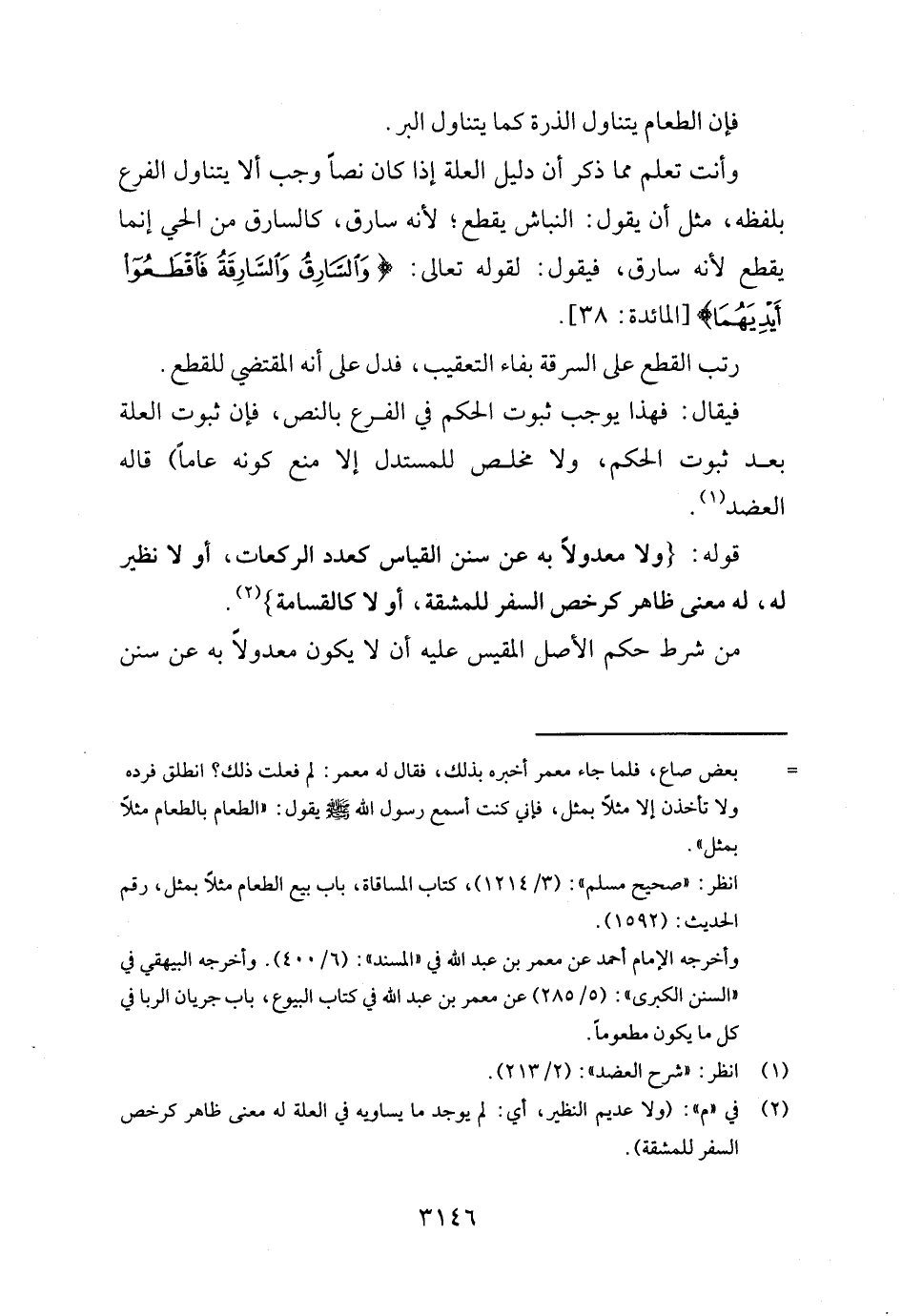 وأ نت تعلم مِمَّا ذكر أَن دَلِيل الْعلَّة إِذا كَانَ نصا وَجب أَلا يتَنَاوَل الْفَرْع بِلَفْظِهِ، مثل أَن يَقُول: النباش يقطع، لِأَنَّهُ سَارِق، كالسارق من الْحَيّ إِنَّمَا يقطع لِأَنَّهُ سَارِق، فَيَقُول: لقَوْله تَعَالَى: {وَالسَّارِق والسارقة فَاقْطَعُوا أَيْدِيهِمَا} [الْمَائِدَة: ٣٨] .