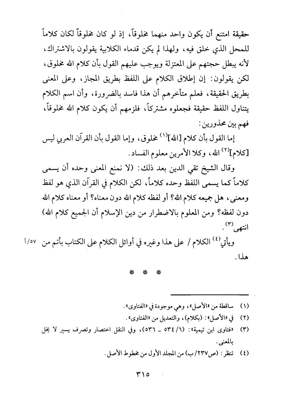 وَقَالَ الشَّيْخ تَقِيّ الدّين بعد ذَلِك: (لَا نمْنَع الْمَعْنى وَحده أَن يُسمى كلَاما كَمَا يُسمى اللَّفْظ وَحده كلَاما، لَكِن الْكَلَام فِي الْقُرْآن الَّذِي هُوَ لفظ وَمعنى، هَل جَمِيعه كَلَام الله؟ أَو لَفظه كَلَام الله دون مَعْنَاهُ؟ أَو مَعْنَاهُ كَلَام الله دون لَفظه؟ وَمن الْمَعْلُوم بالاضطرار من دين الْإِسْلَام أَن الْجَمِيع كَلَام الله) انْتهى.
