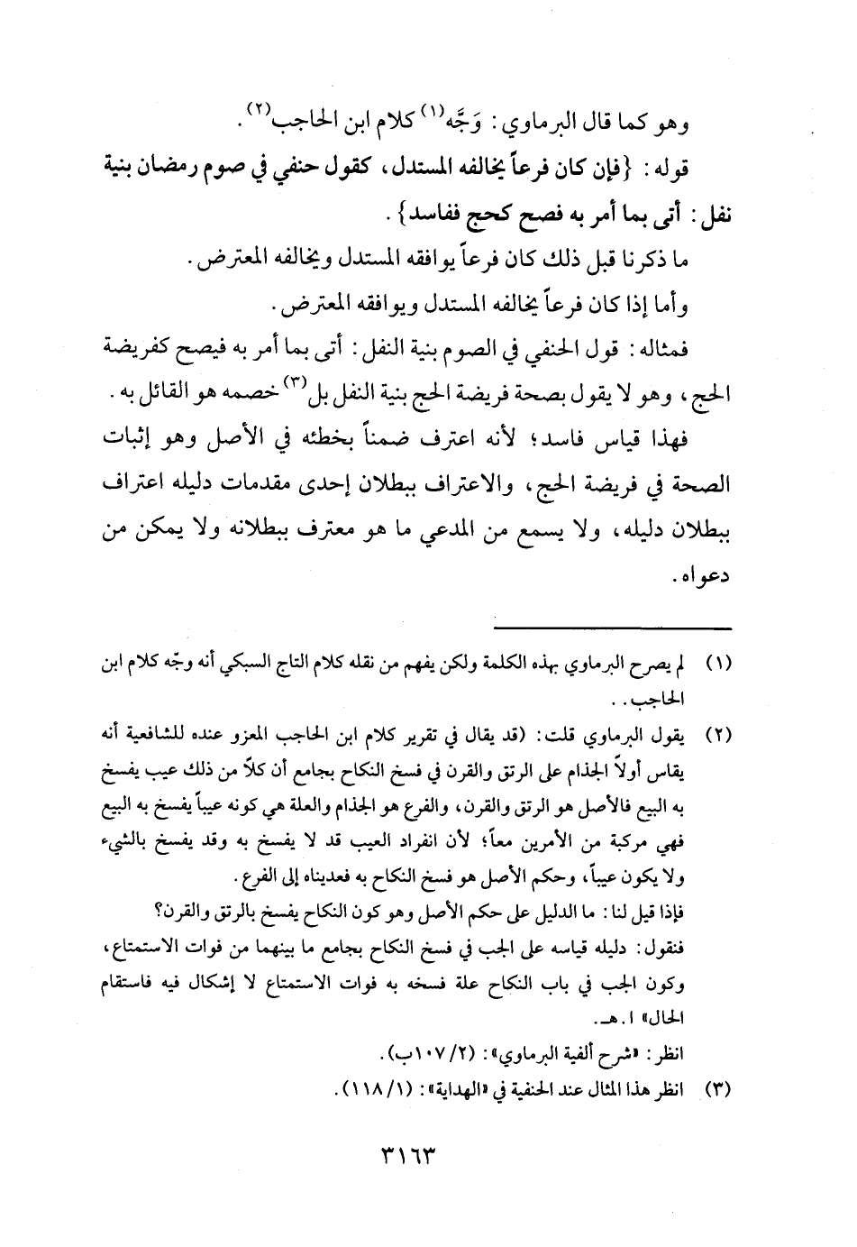 فمثاله: قَول الْحَنَفِيّ فِي الصَّوْم بنية النَّفْل: أَتَى بِمَا أَمر بِهِ فَيصح كفريضة الْحَج، وَهُوَ لَا يَقُول بِصِحَّة فَرِيضَة الْحَج بنية النَّفْل بل خَصمه هُوَ الْقَائِل بِهِ.