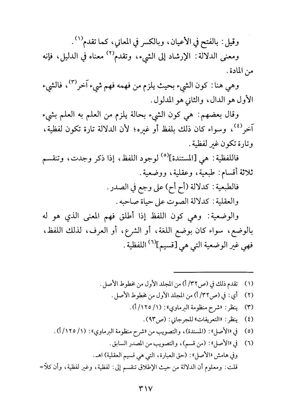 فاللفظية: هِيَ [المستندة] لوُجُود اللَّفْظ، إِذا ذكر وجدت، وتنقسم ثَلَاثَة أَقسَام: طبعية، وعقلية، ووضعية.