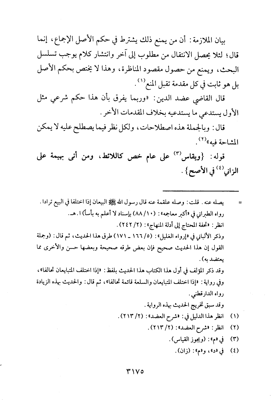 بَيَان الْمُلَازمَة: أَن من يمْنَع ذَلِك يشْتَرط فِي حكم الأَصْل الْإِجْمَاع، إِنَّمَا قَالَ، لِئَلَّا يحصل الِانْتِقَال من مَطْلُوب إِلَى آخر وانتشار كَلَام يُوجب تسلسل الْبَحْث، وَيمْنَع من حُصُول مَقْصُود المناظرة، وَهَذَا لَا يخص بِحكم الأَصْل بل هُوَ ثَابت فِي كل مُقَدّمَة تقبل الْمَنْع.