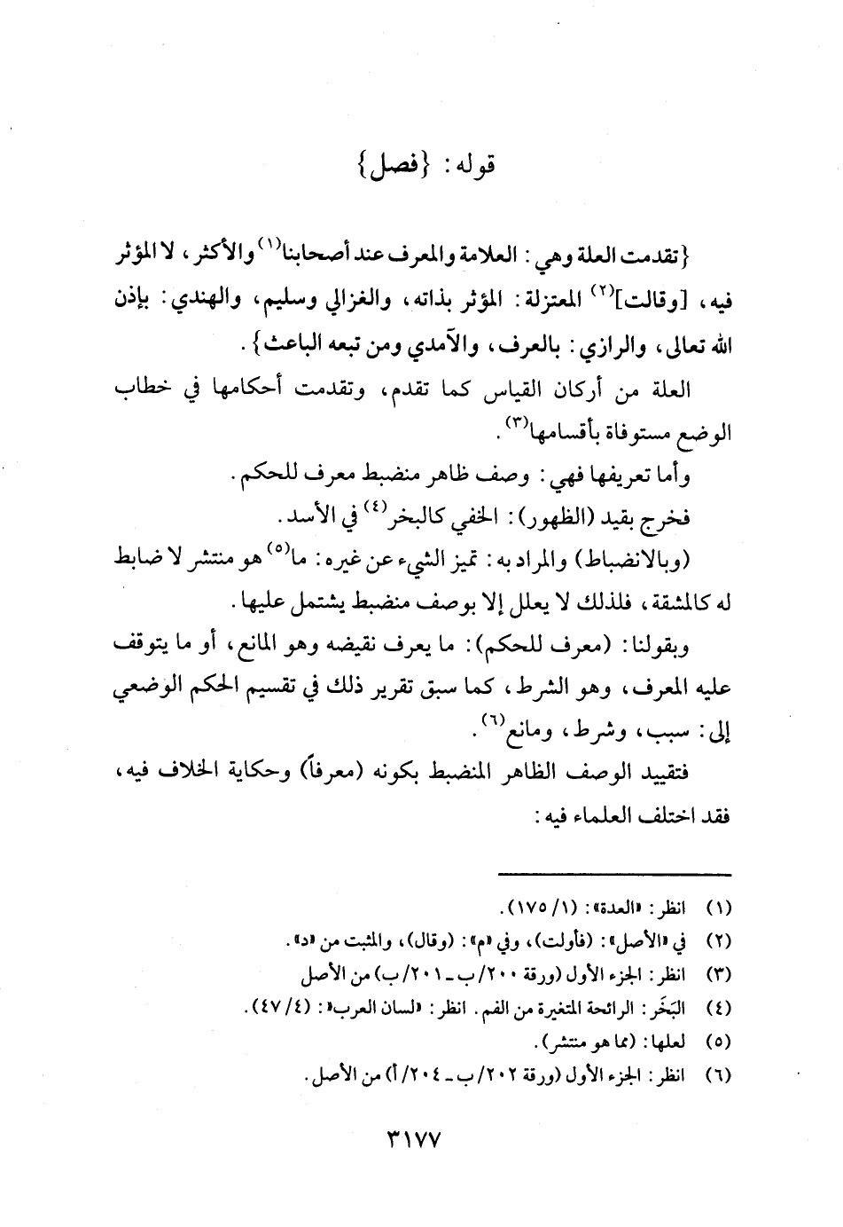 {تقدّمت الْعلَّة وَهِي: الْعَلامَة والمعرف عِنْد أَصْحَابنَا وَالْأَكْثَر، لَا الْمُؤثر فِيهِ، [وَقَالَت] الْمُعْتَزلَة: الْمُؤثر بِذَاتِهِ، وَالْغَزالِيّ وسليم، والهندي: بِإِذن الله تَعَالَى، والرازي: بِالْعرْفِ، والآمدي وَمن تبعه الْبَاعِث} .