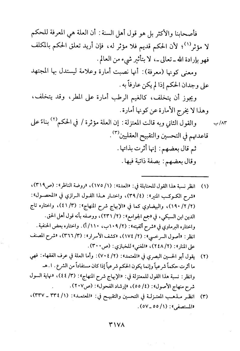 فأصحابنا وَالْأَكْثَر بل هُوَ قَول أهل السّنة: أَن الْعلَّة هِيَ الْمعرفَة للْحكم لَا مُؤثر، لِأَن الحكم قديم فَلَا مُؤثر لَهُ، فَإِن أُرِيد تعلق الحكم بالمكلف فَهُوَ بِإِرَادَة الله - تَعَالَى -، لَا بتأثير شَيْء من الْعَالم.