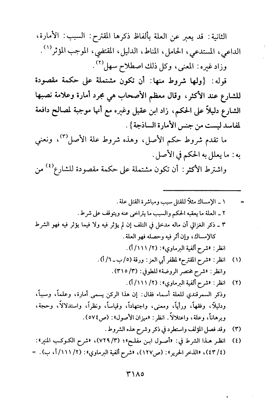 قَوْله: (وَلها شُرُوط مِنْهَا: أَن تكون مُشْتَمِلَة على حِكْمَة مَقْصُودَة للشارع عِنْد الْأَكْثَر، وَقَالَ مُعظم الْأَصْحَاب هِيَ مُجَرّد أَمارَة وعلامة نصبها الشَّارِع دَلِيلا على الحكم، زَاد ابْن عقيل وَغَيره مَعَ أَنَّهَا مُوجبَة لمصَالح دافعة لمفاسد لَيست من جنس الأمارة الساذجة) .