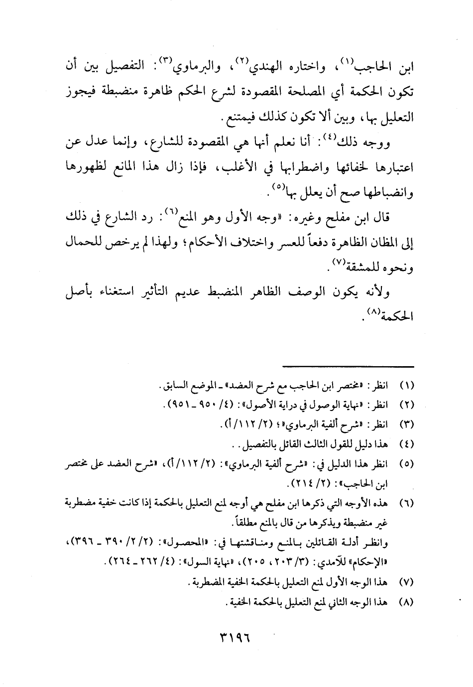 ابْن الْحَاجِب، وَاخْتَارَهُ الْهِنْدِيّ، والبرماوي: التَّفْصِيل بَين أَن تكون الْحِكْمَة أَي الْمصلحَة الْمَقْصُودَة لشرع الحكم ظَاهِرَة منضبطة فَيجوز التَّعْلِيل بهَا، وَبَين أَلا تكون كَذَلِك فَيمْتَنع.