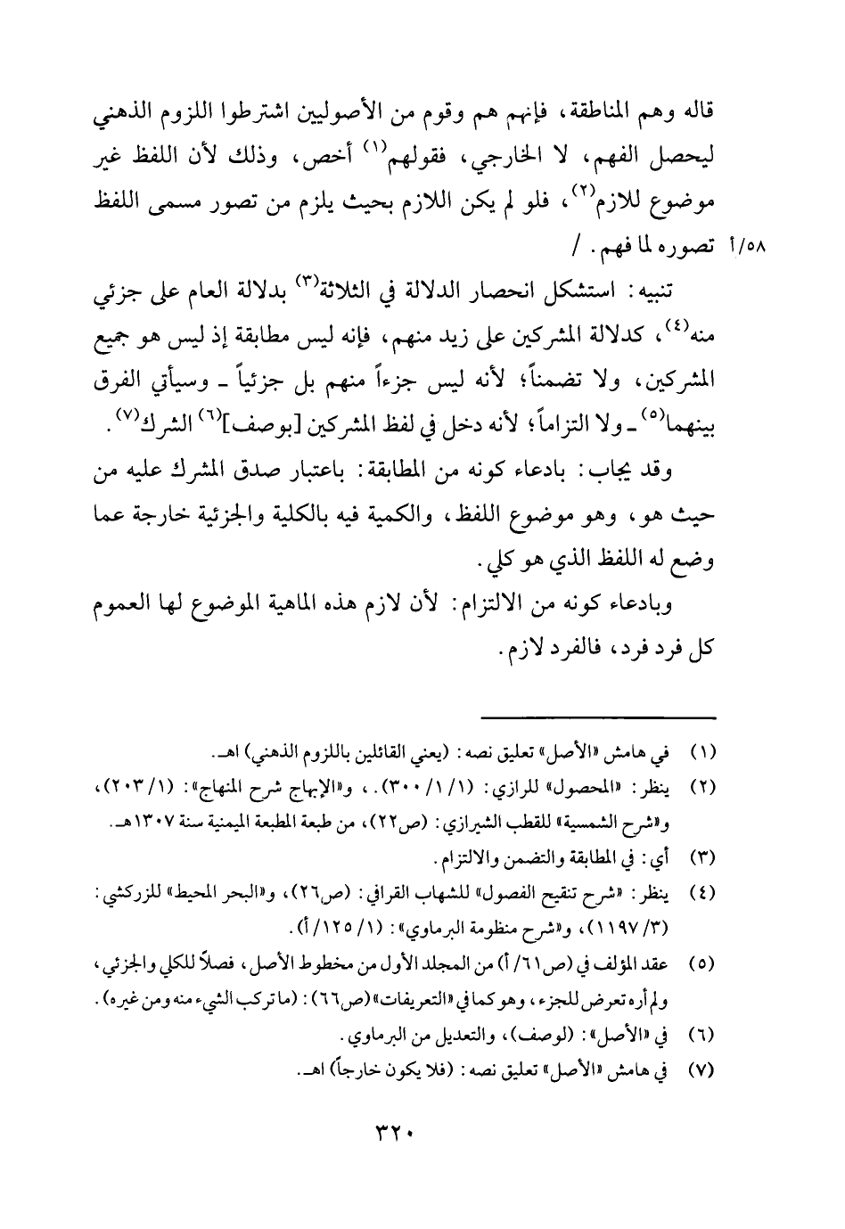 تَنْبِيه: اسْتشْكل انحصار الدّلَالَة فِي الثَّلَاثَة بِدلَالَة الْعَام على جزئي مِنْهُ، كدلالة الْمُشْركين على زيد مِنْهُم، فَإِنَّهُ لَيْسَ مُطَابقَة إِذْ لَيْسَ هُوَ جَمِيع الْمُشْركين، وَلَا تضمناً؛ لِأَنَّهُ لَيْسَ جُزْءا مِنْهُم بل جزئياً - وَسَيَأْتِي الْفرق بَينهمَا - وَلَا التزاماً؛ لِأَنَّهُ دخل فِي لفظ الْمُشْركين [بِوَصْف] الشّرك.