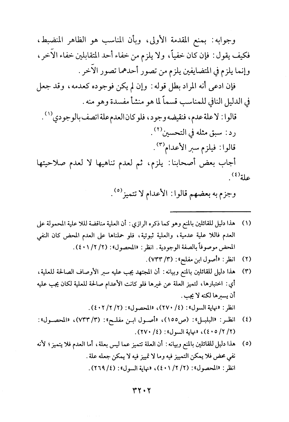 قَالُوا: لَا عِلّة عدم، فنقيضه وجود، فَلَو كَانَ الْعَدَم عِلّة اتّصف بالوجودي. رد: سبق مثله فِي التحسين.