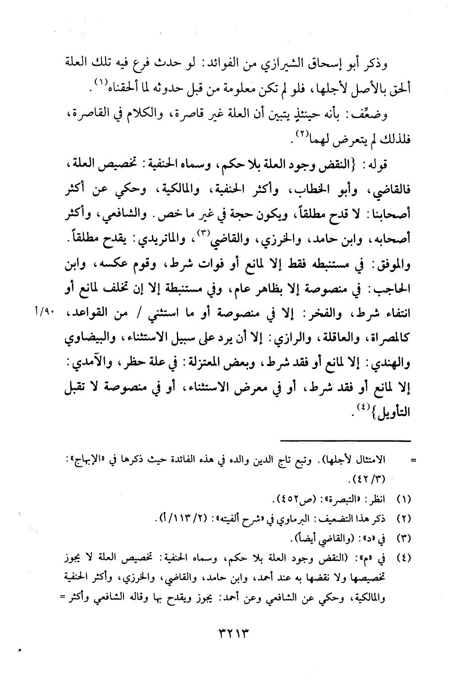 قَوْله: [النَّقْض وجود الْعلَّة بِلَا حكم، وَسَماهُ الْحَنَفِيَّة: تَخْصِيص الْعلَّة، فَالْقَاضِي، وَأَبُو الْخطاب، وَأكْثر الْحَنَفِيَّة، والمالكية، وَحكي عَن أَكثر أَصْحَابنَا: لَا قدح مُطلقًا، وَيكون حجَّة فِي غير مَا خص. وَالشَّافِعِيّ، وَأكْثر أَصْحَابه، وَابْن حَامِد، والخرزي، وَالْقَاضِي، والماتريدي: يقْدَح مُطلقًا. والموفق: فِي مستنبطة فَقَط إِلَّا لمَانع أَو فَوَات شَرط، وَقوم عَكسه، وَابْن الْحَاجِب: فِي منصوصة إِلَّا بِظَاهِر عَام، وَفِي مستنبطه إِلَّا إِن تخلف لمَانع أَو انْتِفَاء شَرط، وَالْفَخْر: إِلَّا فِي منصوصة أَو مَا اسْتثْنِي / من الْقَوَاعِد، كالمصراة، والعاقلة والرازي: إِلَّا أَن يرد على سَبِيل الِاسْتِثْنَاء، والبيضاوي والهندي: إِلَّا لمَانع أَو فقد شَرط وَبَعض الْمُعْتَزلَة: فِي عِلّة حظر، والآمدي: إِلَّا لمَانع أَو فقد شَرط، أَو فِي معرض الِاسْتِثْنَاء، أَو فِي منصوصة لَا تقبل التَّأْوِيل] .