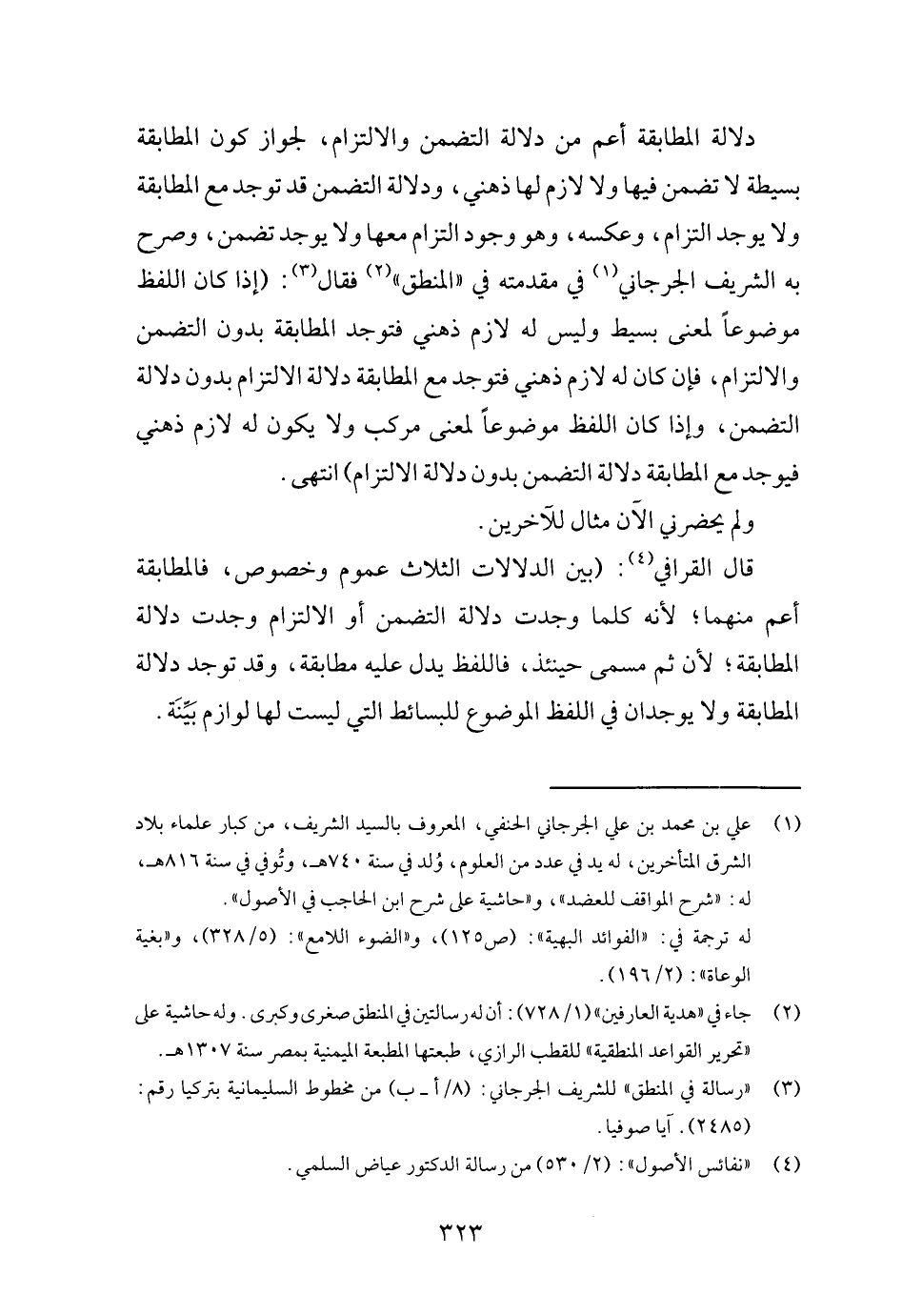 دلَالَة الْمُطَابقَة أَعم من دلَالَة التضمن والالتزام، لجَوَاز كَون الْمُطَابقَة بسيطة لَا تضمن فِيهَا وَلَا لَازم لَهَا ذهني، وَدلَالَة التضمن قد تُوجد مَعَ الْمُطَابقَة وَلَا يُوجد الْتِزَام، وَعَكسه، وَهُوَ وجود الْتِزَام مَعهَا وَلَا يُوجد تضمن، وَصرح بِهِ الشريف الْجِرْجَانِيّ فِي مقدمته فِي " الْمنطق " فَقَالَ: (إِذا كَانَ اللَّفْظ مَوْضُوعا لِمَعْنى بسيط وَلَيْسَ لَهُ لَازم ذهني فتوجد الْمُطَابقَة بِدُونِ التضمن والالتزام، فَإِن كَانَ لَهُ لَازم ذهني فتوجد مَعَ الْمُطَابقَة دلَالَة الِالْتِزَام بِدُونِ دلَالَة التضمن، وَإِذا كَانَ اللَّفْظ مَوْضُوعا لِمَعْنى مركب وَلَا يكون لَهُ لَازم ذهني فيوجد مَعَ الْمُطَابقَة دلَالَة التضمن بِدُونِ دلَالَة الِالْتِزَام) انْتهى.