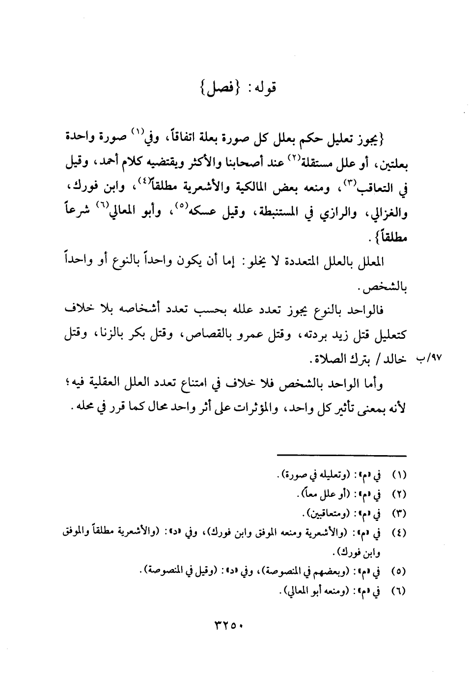 [يجوز تَعْلِيل حكم بعلل كل صُورَة بعلة اتِّفَاقًا، وَفِي صُورَة وَاحِدَة بعلتين، أَو علل مُسْتَقلَّة عِنْد أَصْحَابنَا وَالْأَكْثَر ويقتضيه كَلَام أَحْمد، وَقيل فِي التَّعَاقُب، وَمنعه بعض الْمَالِكِيَّة والأشعرية مُطلقًا، وَابْن فورك، وَالْغَزالِيّ، والرازي فِي المستنبطة، وَقيل عسكه، وَأَبُو الْمَعَالِي شرعا مُطلقًا] .