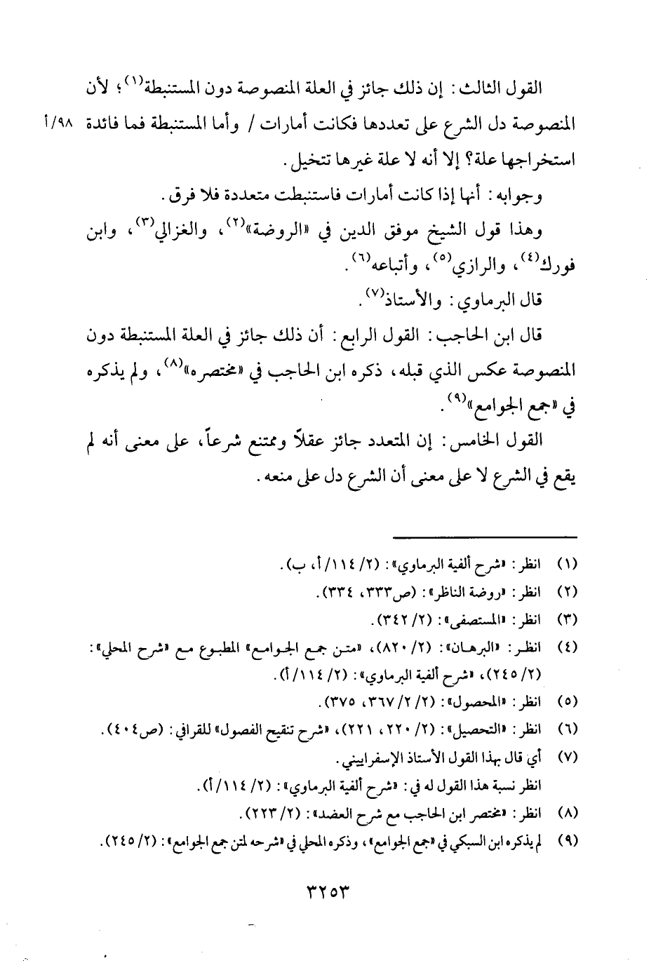 القَوْل الثَّالِث: إِن ذَلِك جَائِز فِي الْعلَّة المنصوصة دون المستنبطة؛ لِأَن المنصوصة دلّ الشَّرْع على تعددها فَكَانَت أَمَارَات / وَأما المستنبطة فَمَا فَائِدَة استخراجها عِلّة؟ إِلَّا أَنه لَا عِلّة غَيرهَا تتخيل.