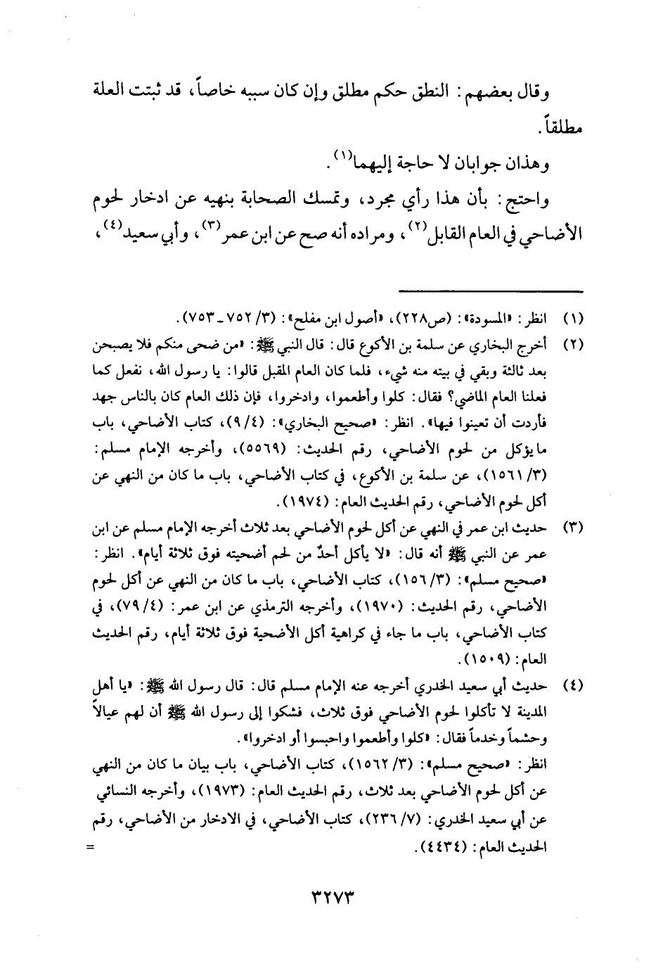 وَاحْتج: بِأَن هَذَا رَأْي مُجَرّد، وَتمسك الصَّحَابَة بنهيه عَن ادخار لُحُوم الْأَضَاحِي فِي الْعَام الْقَابِل، وَمرَاده أَنه صَحَّ عَن ابْن عمر، وَأبي سعيد،
