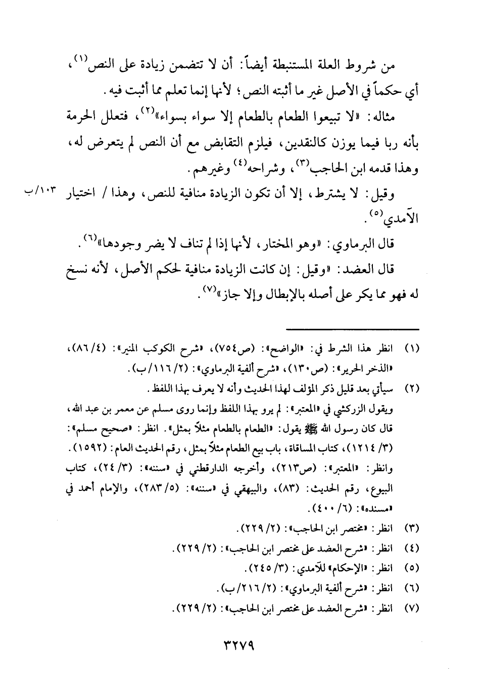 من شُرُوط الْعلَّة المستنبطة أَيْضا: أَن لَا تَتَضَمَّن زِيَادَة على النَّص، أَي حكما فِي الأَصْل غير مَا أثْبته النَّص؛ لِأَنَّهَا إِنَّمَا تعلم مِمَّا أثبت فِيهِ.