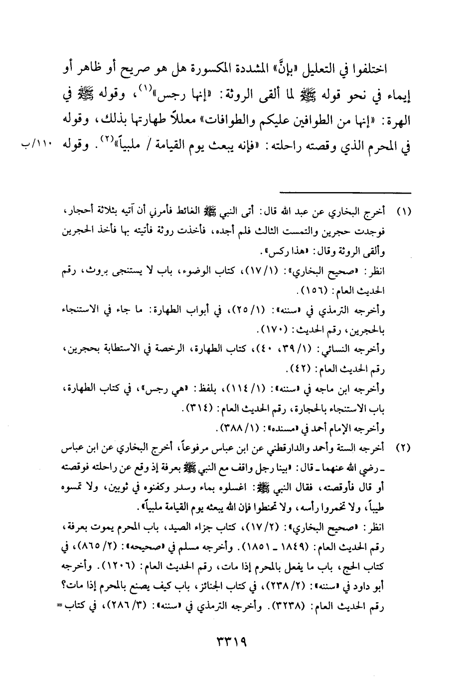 اخْتلفُوا فِي التَّعْلِيل " بإن " الْمُشَدّدَة الْمَكْسُورَة هَل هُوَ صَرِيح أَو ظَاهر أَو إِيمَاء فِي نَحْو قَوْله - صَلَّى اللَّهُ عَلَيْهِ وَسَلَّم َ - لما ألْقى الروثة: " إِنَّهَا رِجْس "، وَقَوله - صَلَّى اللَّهُ عَلَيْهِ وَسَلَّم َ - فِي الْهِرَّة: " إِنَّهَا من الطوافين عَلَيْكُم والطوافات " مُعَللا طَهَارَتهَا بذلك، وَقَوله فِي الْمحرم الَّذِي وقصته رَاحِلَته: " فَإِنَّهُ يبْعَث يَوْم الْقِيَامَة / ملبيا ". وَقَوله