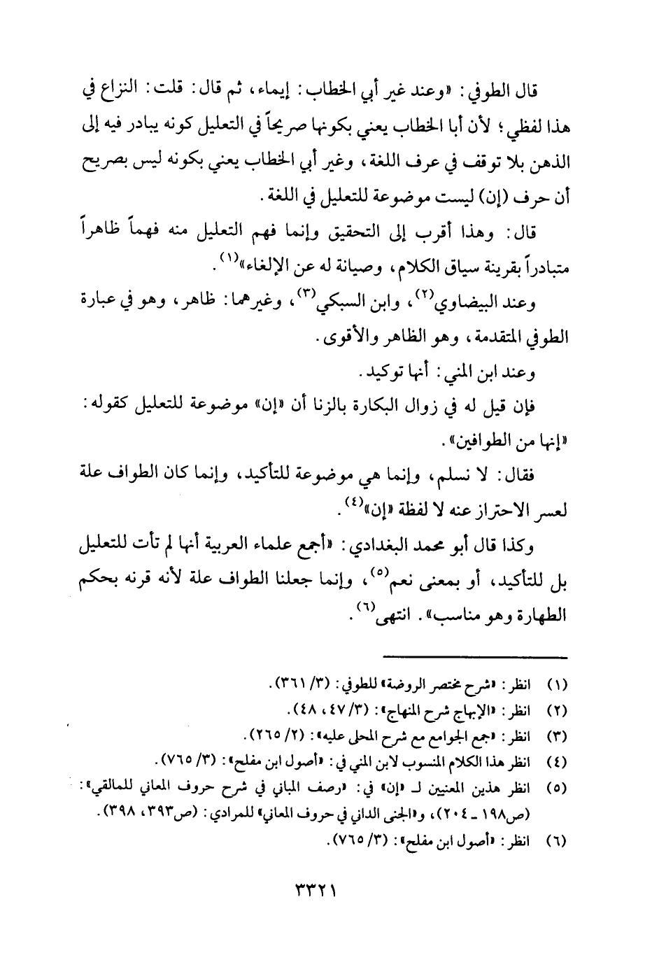وَكَذَا قَالَ أَبُو مُحَمَّد الْبَغْدَادِيّ: " أجمع عُلَمَاء الْعَرَبيَّة أَنَّهَا لم تأت للتَّعْلِيل بل للتَّأْكِيد، أَو بِمَعْنى نعم، وَإِنَّمَا جعلنَا الطّواف عِلّة لِأَنَّهُ قرنه بِحكم الطَّهَارَة وَهُوَ مُنَاسِب " انْتهى.