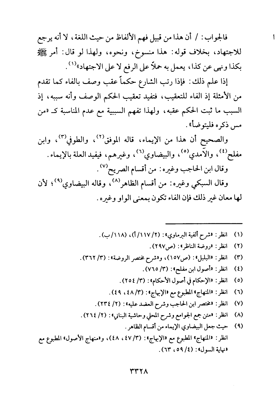 وَالصَّحِيح أَن هَذَا من الْإِيمَاء، قَالَه الْمُوفق، والطوفي، وَابْن مُفْلِح، والآمدي، والبيضاوي، وَغَيرهم، فَيُفِيد الْعلَّة بِالْإِيمَاءِ.