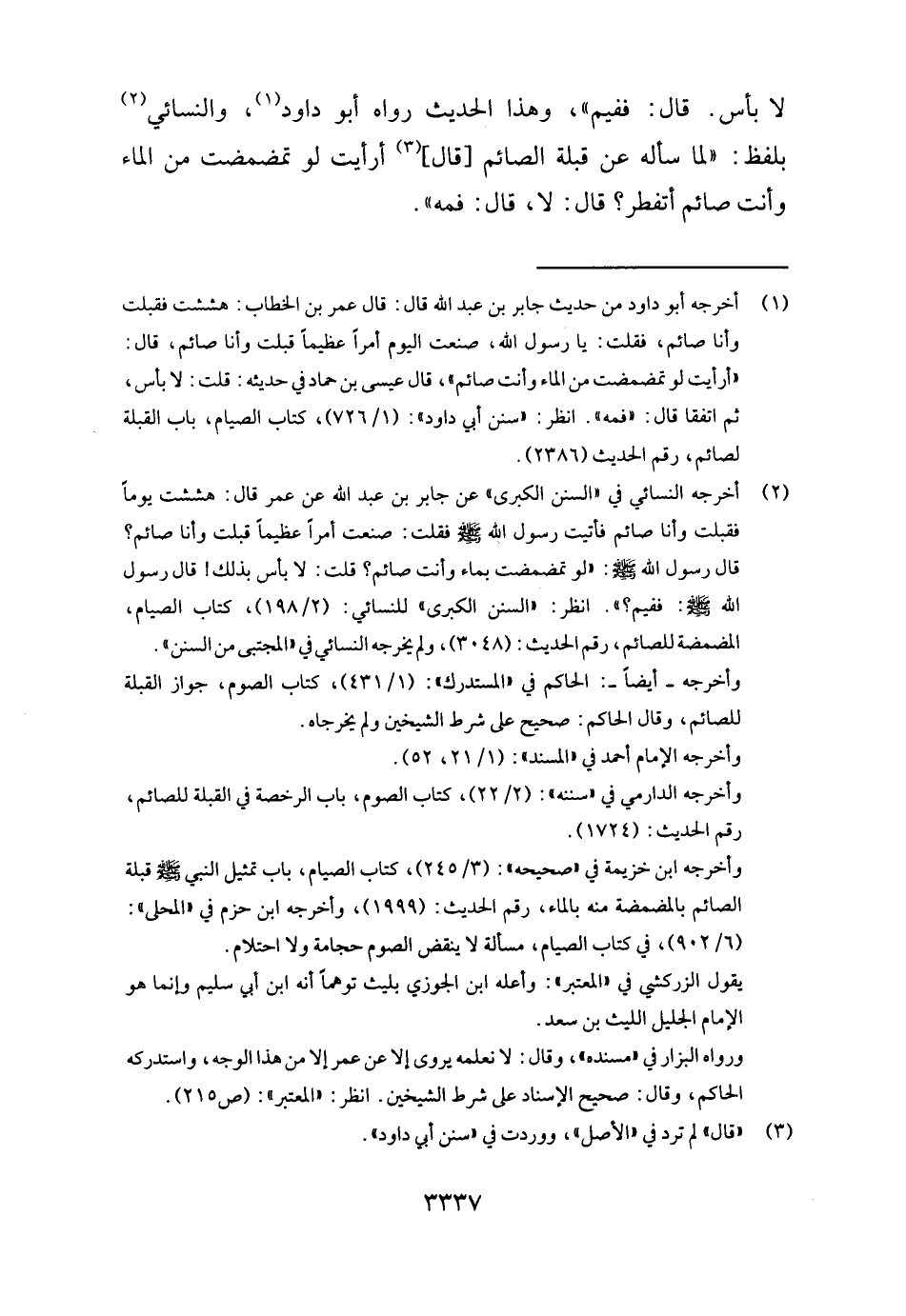 لَا بَأْس. قَالَ: فَفِيمَ "، وَهَذَا الحَدِيث رَوَاهُ أَبُو دَاوُد، وَالنَّسَائِيّ بِلَفْظ: " لما سَأَلَهُ عَن قبْلَة الصَّائِم [قَالَ] أَرَأَيْت لَو تمضمضت من المَاء وَأَنت صَائِم أتفطر؟ قَالَ: لَا، قَالَ: فَمه ".