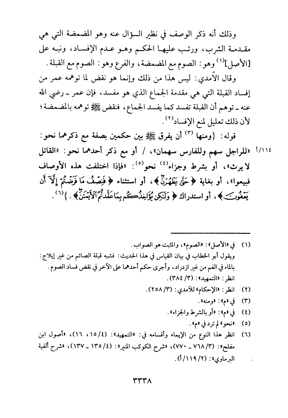 وَقَالَ الْآمِدِيّ: لَيْسَ هَذَا من ذَلِك وَإِنَّمَا هُوَ نقض لما توهمه عمر من إِفْسَاد الْقبْلَة الَّتِي هِيَ مُقَدّمَة الْجِمَاع الَّذِي هُوَ مُفسد، فَإِن عمر _ رَضِي اللَّهِ عَنهُ - توهم أَن الْقبْلَة تفْسد كَمَا يفْسد الْجِمَاع، فنقض - صَلَّى اللَّهُ عَلَيْهِ وَسَلَّم َ - توهمه بالمضمضة؛ لِأَن ذَلِك تَعْلِيل لمنع الْإِفْسَاد.